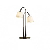 This charming table lamp features two adjustable heads each with its own on-off switch, making it perfect for a variety of different tasks including reading, illuminating an object of interest, or creating soft ambient light. With a rich bronze finish and a pair of white pleated lampshades, this piece is a sturdy, attractive addition to desk or bedside. Uses two 60-watt bulbs. DL # 22179.