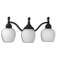 The Moen Monticello three-light bath bar lighting fixture gives any bathroom an eye-catching, sophisticated edge. The fixture features three globes, each made with opal white glass. Each globe is supported by one oil-rubbed bronze finished arm, with all three arms meeting at a central wall mount base.